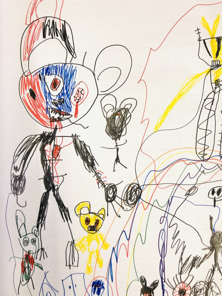 それは子どもの無意識と意識との間を行き来する作業であり、子どもの善と悪、安心と不安、安堵と恐怖の間を行き来する作業です。おえかきをする子どもへの尊敬と信頼に基づく作業とも言えます。