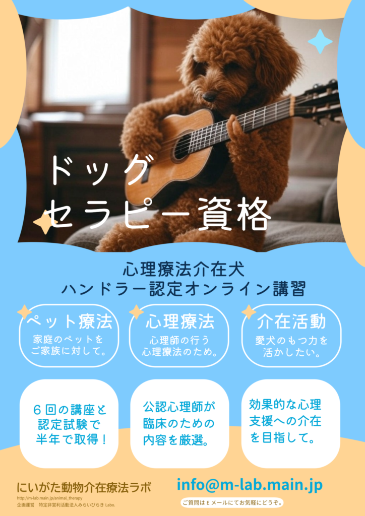 ※ 本資格は、心理療法介在犬のハンドラーとして持つべき基礎的な知識を習得したことを特定非営利活動法人みらいびらき Labo.(NPO法人内事業「にいがた動物介在療法ラボ」)が認定するものです。